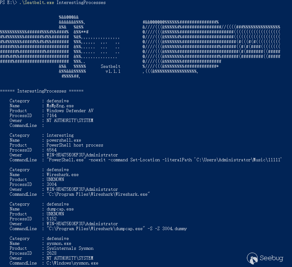 (2)Seatbelt的InterestingProcesses命令,C#开发的多功能信息搜集工具,可单独使用,可结合其他程序实现内存加载。