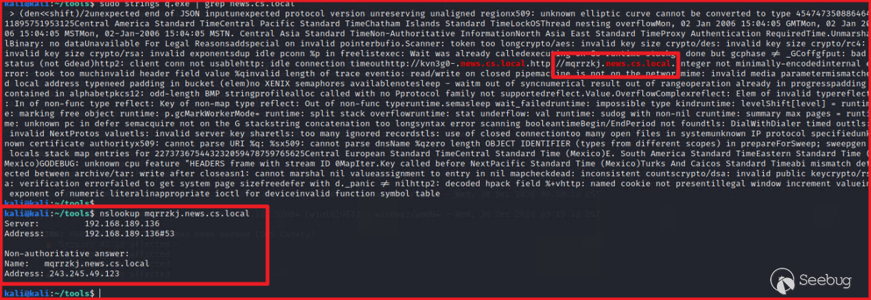 如下图,红队人员在创建implant的时候,设置DNS canary为mews.cs.local,在生成的implant中,嵌入了mqrrzkj.news.cs.local.和kvn3g0-.news.cs.local两个域名。