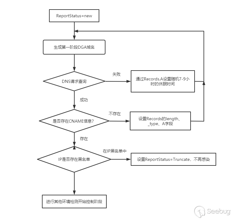 (3)如果检查通过,尝试使用DGA算法生成的域名发送DNS上线通知,并检查DNS解析结果是否满足自身运行要求。