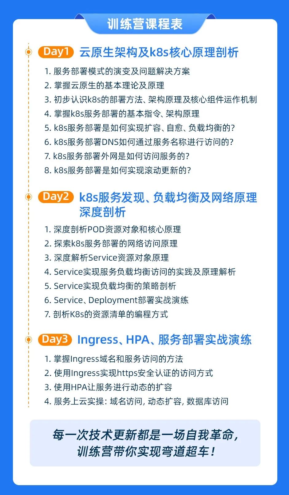 训练营针对当前一线企业需求,内容由浅入深,从云原生基本理论及原理,到框架核心特性的剖析,再到实战演练部署,从0开始让你优雅实现K8s 与微服务的完美结合。大家可以感受一下详细内容: