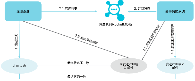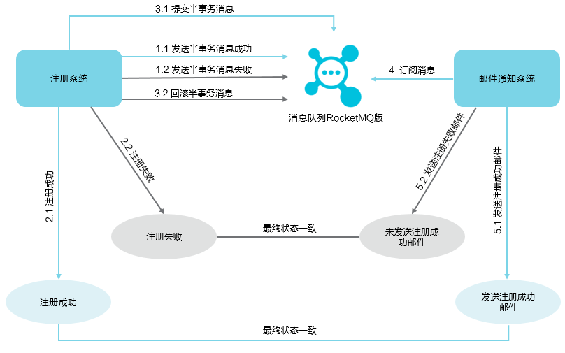 邮件通知系统发送注册成功邮件。(最终注册系统与邮件通知系统数据一致) 关于分布式事务消息的更多详细内容,请参见事务消息。