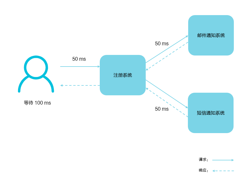 假设每个任务耗时分别为50 ms,其中,邮件和短信通知并行完成,则用户需要在注册页面等待总共100 ms才能登录。