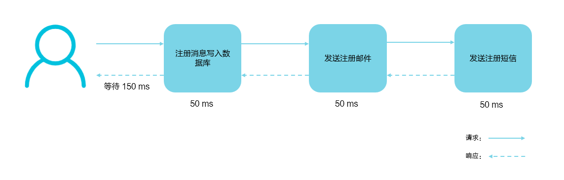 假设每个任务耗时分别为50 ms,则用户需要在注册页面等待总共150 ms才能登录。 -