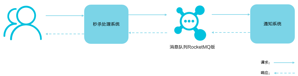 在秒杀或团队抢购活动中,由于用户请求量较大,导致流量暴增,秒杀的应用在处理如此大量的访问流量后,下游的通知系统无法承载海量的调用量,甚至会导致系统崩溃等问题而发生漏通知的情况。为解决这些问题,可在应用和下游通知系统之间加入消息队列RocketMQ。