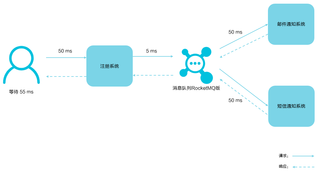 对于注册系统而言,发送注册成功的短信和邮件通知并不一定要绑定在一起同步完成,所以实际当数据写入注册系统后,注册系统就可以把其他的操作放入对应的消息队列RocketMQ中然后马上返回用户结果,由消息队列RocketMQ异步地进行这些操作。