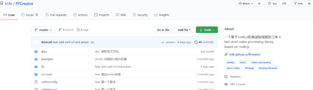 不过,目前知道FFCreator的人并不是很多,在Github上标星只有678,累计分支68个。(Github地址:https://github.com/tnfe/FFCreator),当你需要大量大量处理视频同时又不需要特别酷炫的过渡动画时,FFCreatorLite一定适合你。