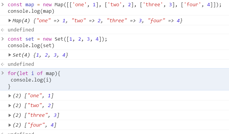 一个Map对象在迭代时会根据对象中元素的插入顺序来进行 — 一个 for...of 循环在每次迭代后会返回一个形式为[key,value]的数组。