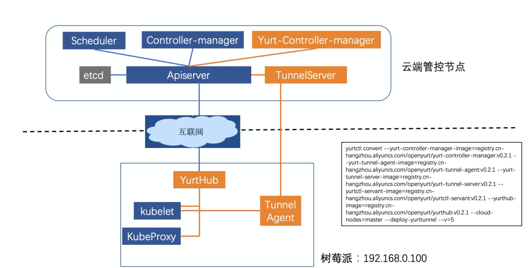 yurtctl convert --yurt-controller-manager-image=registry.cn-hangzhou.aliyuncs.com/openyurt/yurt-controller-manager:v0.2.1 --yurt-tunnel-agent-image=registry.cn-hangzhou.aliyuncs.com/openyurt/yurt-tunnel-agent:v0.2.1 --yurt-tunnel-server-image=registry.cn-hangzhou.aliyuncs.com/openyurt/yurt-tunnel-server:v0.2.1 --yurtctl-servant-image=registry.cn-hangzhou.aliyuncs.com/openyurt/yurtctl-servant:v0.2.1 --yurthub-image=registry.cn-hangzhou.aliyuncs.com/openyurt/yurthub:v0.2.1 --cloud-nodes=master-node --deploy-yurttunnel