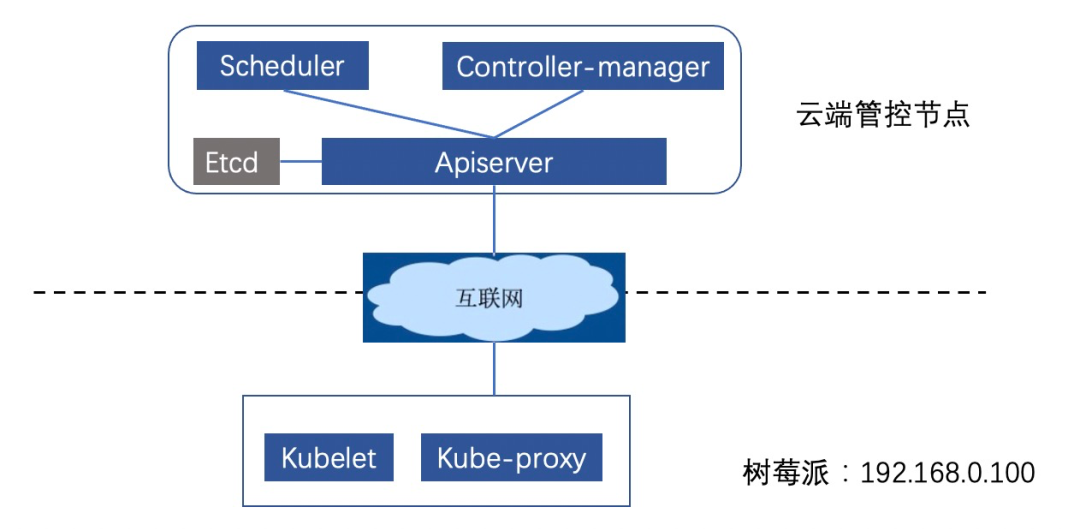 如图 1 所示,本文通过在云端部署 Kubernetes 集群的控制面,并将树莓派接入集群来搭建云管边场景。基于这个环境演示 OpenYurt 的核心能力,带大家快速上手 OpenYurt。