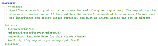 | <mirror> <id>alimaven</id> <name>aliyun maven</name> <url>http://maven.aliyun.com/nexus/content/groups/public/</url> <mirrorOf>central</mirrorOf> </mirror> </mirrors> |