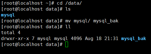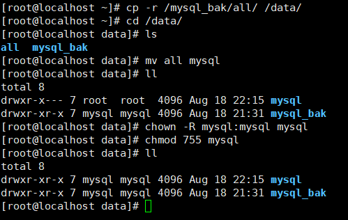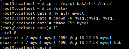 [root@localhost ~]# cp -r /mysql_bak/all/ /data/[root@localhost ~]# cd /data/[root@localhost data]# lsall mysql_bak[root@localhost data]# mv all mysql[root@localhost data]# lltotal 8drwxr-x--- 7 root root 4096 Aug 18 22:15 mysqldrwxr-xr-x 7 mysql mysql 4096 Aug 18 21:31 mysql_bak[root@localhost data]# chown -R mysql:mysql mysql[root@localhost data]# chmod 755 mysql[root@localhost data]# lltotal 8drwxr-xr-x 7 mysql mysql 4096 Aug 18 22:15 mysqldrwxr-xr-x 7 mysql mysql 4096 Aug 18 21:31 mysql_bak[root@localhost data]#