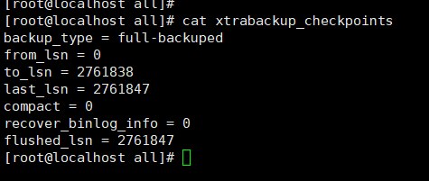 这里有备份的数据库名字外,还有一些xtrabackup开头的文件xtrabackup_checkpoints文件记录备份完成时的lsn号和该次备份的类型,是全量备份,标识符是full-backuped
