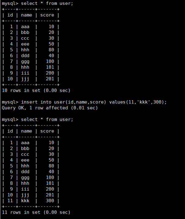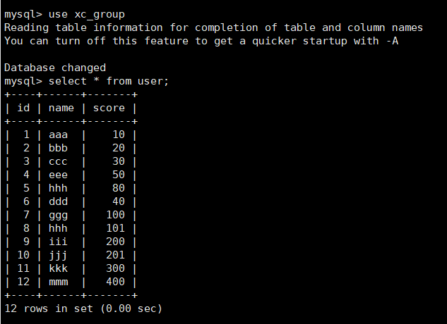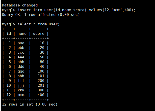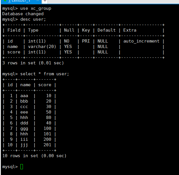 启动MySQL,新建一个database和user表,并插入一些数据