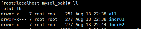 [root@localhost ~]# cp -r /mysql_bak/all/ /data/[root@localhost ~]# cd /data/[root@localhost data]# mv all/ mysql[root@localhost data]# chown -R mysql:mysql mysql[root@localhost data]# chmod 755 mysql[root@localhost data]# lltotal 8drwxr-xr-x 7 mysql mysql 4096 Aug 18 22:56 mysqldrwxr-xr-x 7 mysql mysql 4096 Aug 18 22:53 mysql_bak[root@localhost data]#