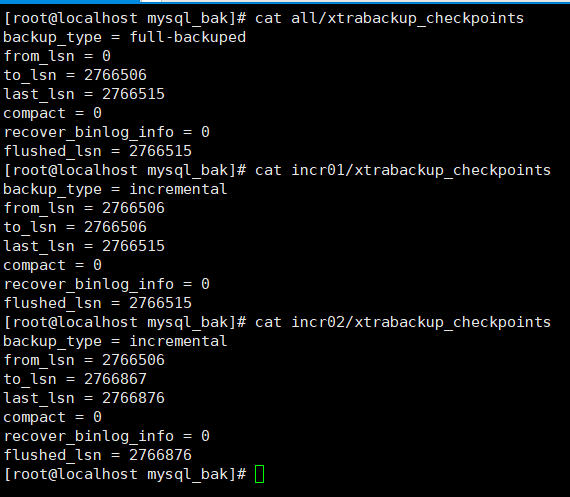 包括all全备,incr01第一次增备和incr02第二次增备,再看看各个xtrabackup_checkpoints的lsn信息和backup_type信息,backup_type表明该次备份属于全备类型还是增备类型。