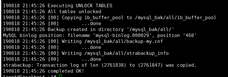 --no-timestamp:不使用系统默认的备份名,自己自定义备份名/mysql_bak/all,表示全备到all目录下,当出现如下截图,说明全备成功