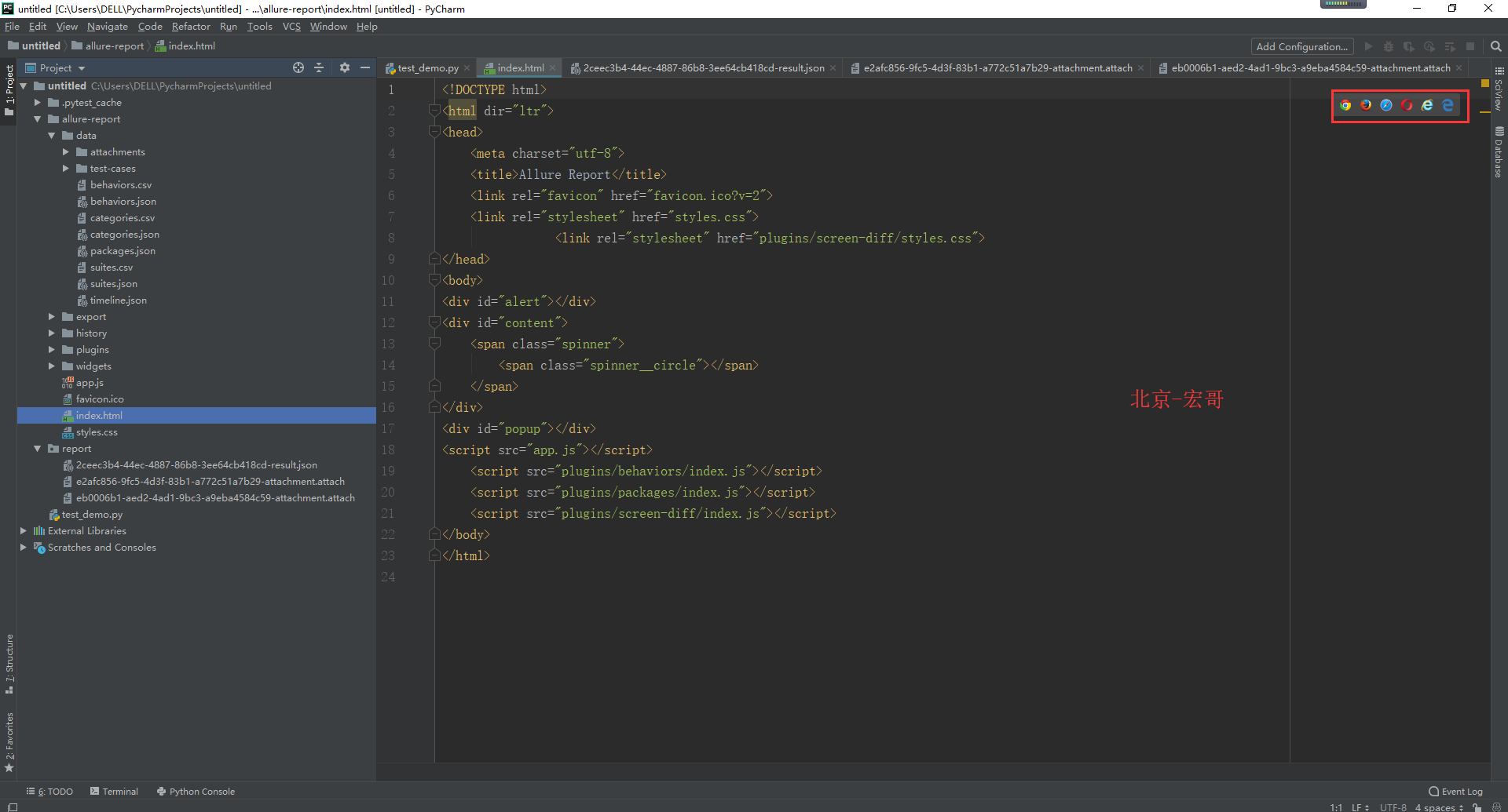 回到根目录下,会生成一个allure-report的文件夹,在pycharm中打开文件夹,点击index.html运行