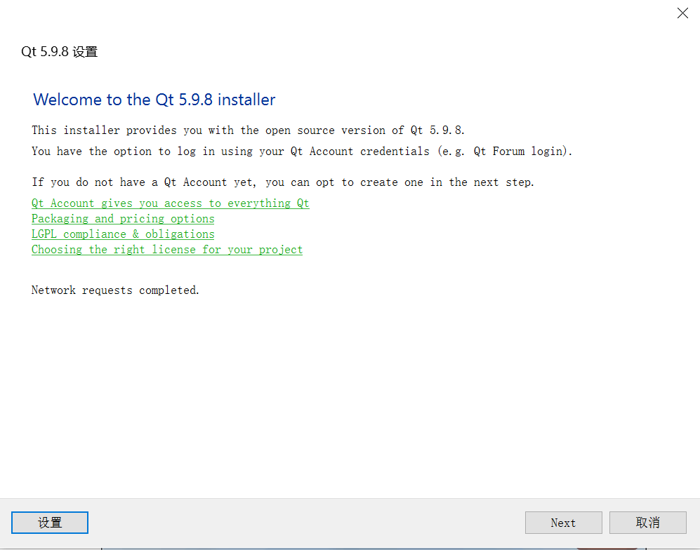 双击下载得到的 qt-opensource-windows-x86-5.9.0.exe 即可开始安装。Qt 的安装过程和普通的 Windows 软件一样,按照向导进行操作即可。