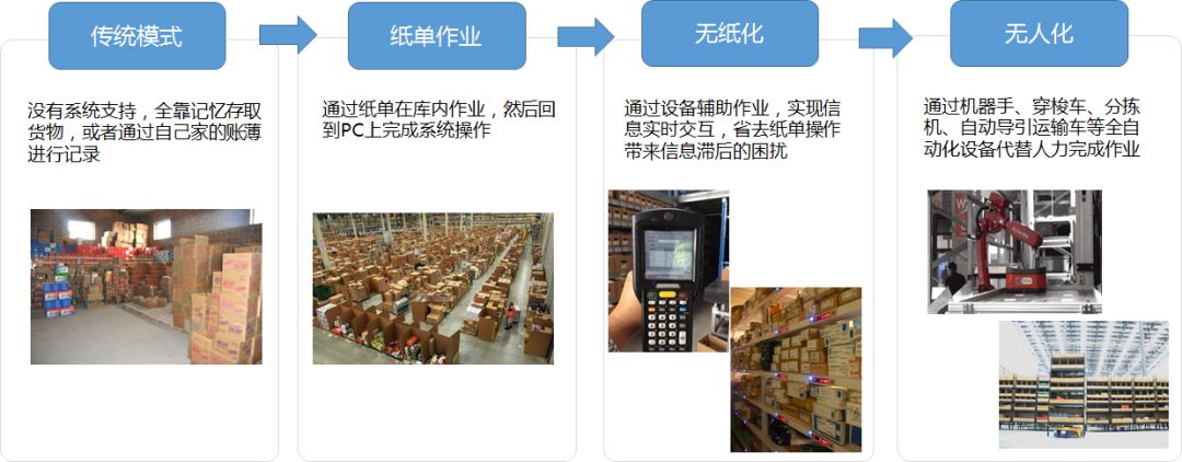 纵观库房的发展,按照作业模式可划分为4大阶段: