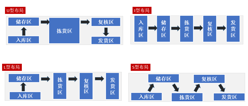 (2)单一物流流向:布局需适应仓库生产流程,按一个方向流动,例如装卸区、验收区、发货区;