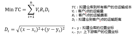 仅以总运输成本作为考量依据,寻找到达上下游客户中总运输成本最低的地址作为新仓地址,具体公式如下: