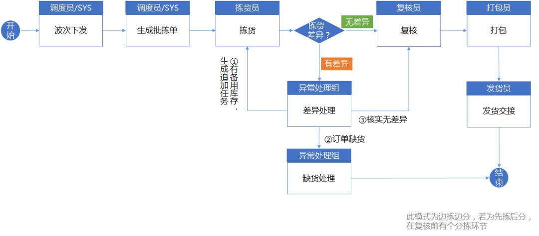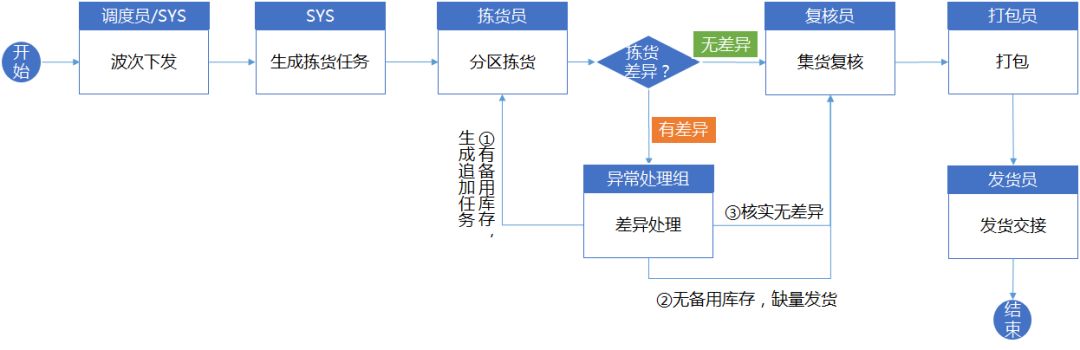 ④拣货过程中若无差异,分拣完成后即可进入复核打包环节,若有拣货差异(如账实不符),需要异常处理组介入,对订单进行差异处理,差异处理主要有三种结果: