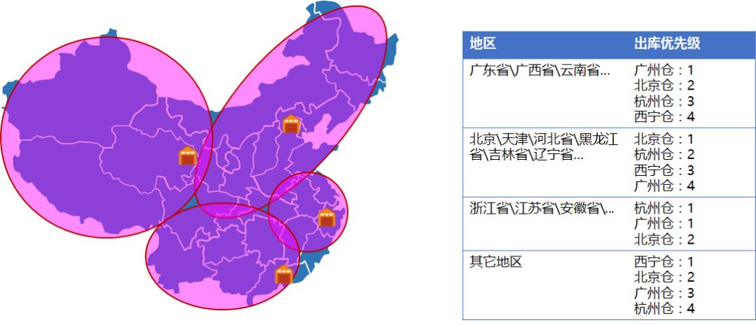 按照业务规划,广州仓覆盖广东、广西、云南等省份,当有这些省份的订单下发后,会优先分配广州仓发货,如果广州仓缺货无法配送,则依次按照北京仓、杭州仓、西宁仓的顺序分配仓库发出,作为广州仓的补充。