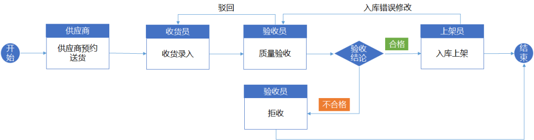③验收员提取已保存的收货单,打印验收单(或直接在PDA或收货台车显示屏上)对到货商品进行验收,验收为合格的商品可进入库房指定区域上架,若不合格,进行拒收处理;若发现验收数据因收货员录入错误,可驳回至对应收货员重新录入修正数据;