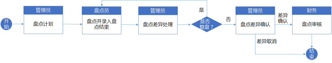 ③盘点完成后,库管员核实盘点结果,判断是否需要复盘,若需要复盘,再次对盘点单中需要复盘的库存明细重新生成盘点任务;