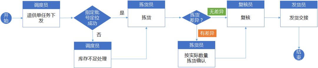 ①退供单由上游采购系统下达WMS库房后,库房调度员根据退供单中指定的批号下发任务;退供应商一般允许缺量发货,若下发过程中发现指定批号库存不足,可修改下发数量,按照实际批号数量出库;