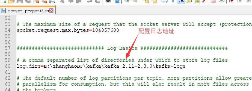 - 打开目录E:\zhanghaoBF\kafka\kafka_2.11-2.3.0\config下server.properties文件,把log.dirs修改为【log.dirs=D:\kafka_2.12-0.11.0.0\kafka-logs】,把listeners的配置放开