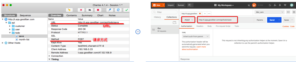 2.1、根据charles获取的参数填写到Postman中【URL和请求方式】