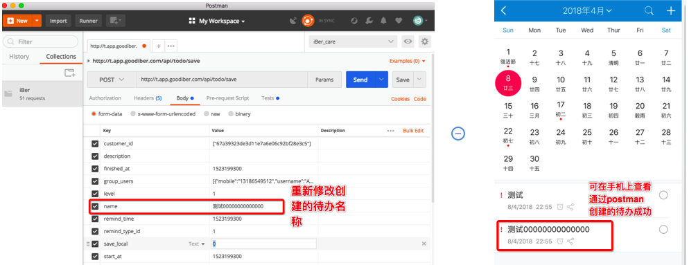 2.6、通过修改request时的参数,重新进行send,在手机上查看创建的待办是否成功。