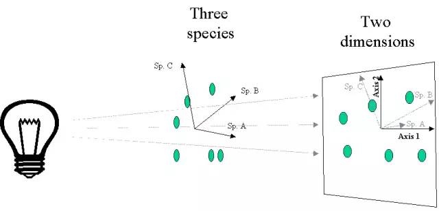 主坐标分析(Principal Coordinates Analysis,PCoA),即经典多维标度(Classical multidimensional scaling),用于研究数据间的相似性。PCoA与PCA都是降低数据维度的方法,**但是差异在在于PCA是基于原始矩阵,而PCoA是基于通过原始矩阵计算出的距离矩阵。**因此,PCA是尽力保留数据中的变异让点的位置不改动,而PCoA是尽力保证原本的距离关系不发生改变,也就是使得原始数据间点的距离与投影中即结果中各点之间的距离尽可能相关(如图)。