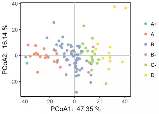 其实不论是PCoA还是PCA图均是用散点图来展示结果PCoA和PCA的结果,PCoA和PCA准确来讲是数据降维分析方法。