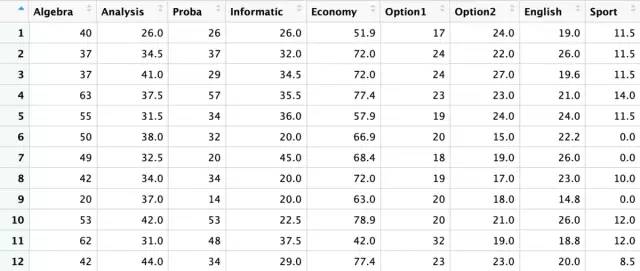 R中有很多包都提供了PCA和PCoA,比如常用的ade4包。本文将基于该包进行PCA和PCoA的分析,数据是自带的deug,该数据提供了104个学生9门课程的成绩(见截图)和综合评定。综合评定有以下几个等级:A+,A,B,B-,C-,D。让我们通过PCA和PCoA来看一看这样的综合评定是否合理,是否确实依据这9门课把这104个学生合理分配到不同组(每个等级一个组)。