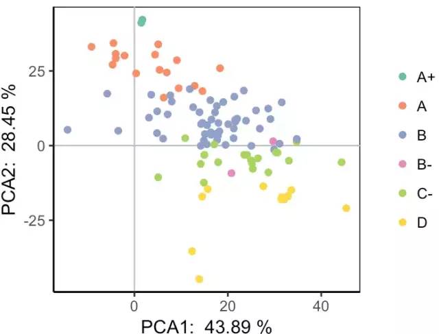 因为没有现成可供分享的微生物组数据,所以用了这个成绩的数据集。通常来说在微生物组的研究中,我们会根据物种丰度的文件对数据进行PCA或者PCoA分析,也是我们所说的beta-diveristy分析,根据PCA或者PCoA的结果看疾病组和对照组能否分开,以了解微生物组的总体变化情况。