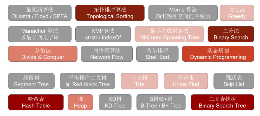 为了让大家更有针对性、更高效的去刷题,《九章算法班》的令狐冲老师已经划分好了大厂面试中最常考的算法和数据结构,颜色越红考的越多,灰色的不考或者出现的概率低于千分之一。