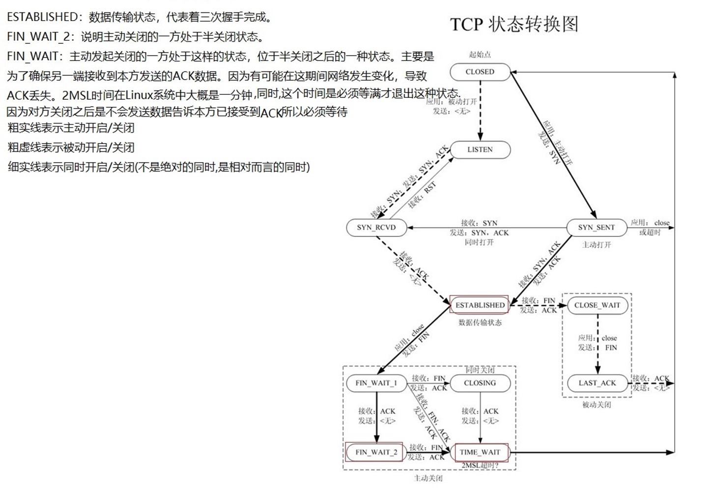TIME_WAIT: 表示收到了对方的FIN报文,并发送出了ACK报文,等2MSL后即可回到CLOSED可用状态。如果FIN_WAIT_1状态下,收到对方同时带 FIN标志和ACK标志的报文时,可以直接进入到TIME_WAIT状态,而无须经过FIN_WAIT_2状态。