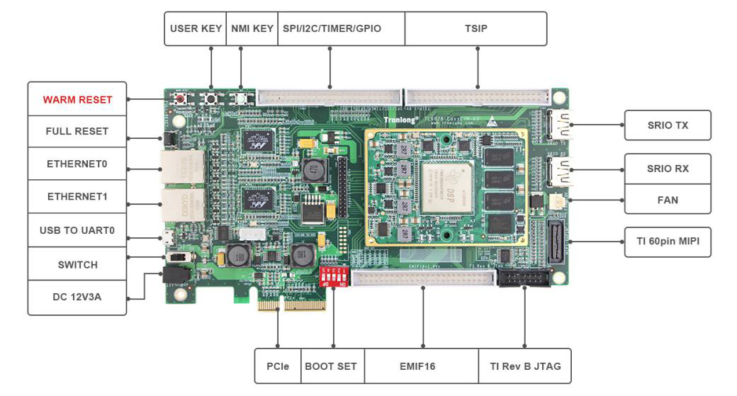 TL6678-EasyEVM是一款基于TI KeyStone架构C6000系列TMS320C6678八核C66x定点/浮点高性能处理器设计的高端多核DSP评估板,由核心板与底板组成。核心板经过专业的PCB Layout和高低温测试验证,稳定可靠,可满足各种工业应用环境。