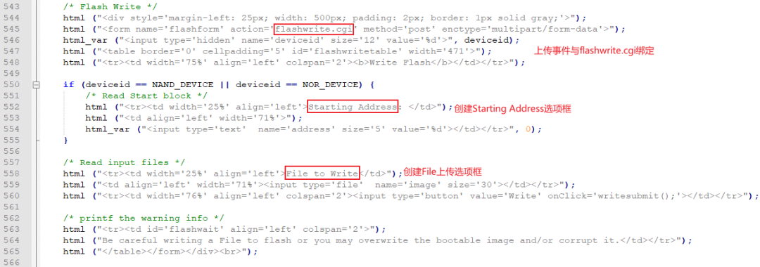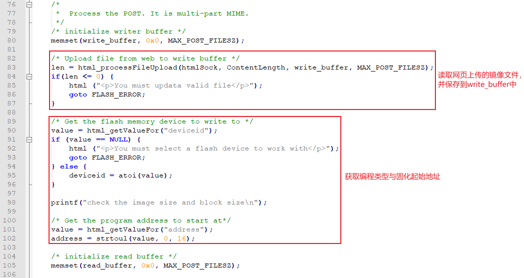 (12)按下Write按钮后,将触发serveFlashWritePage(),在函数中获取上传文件并保存至write_buffer中。