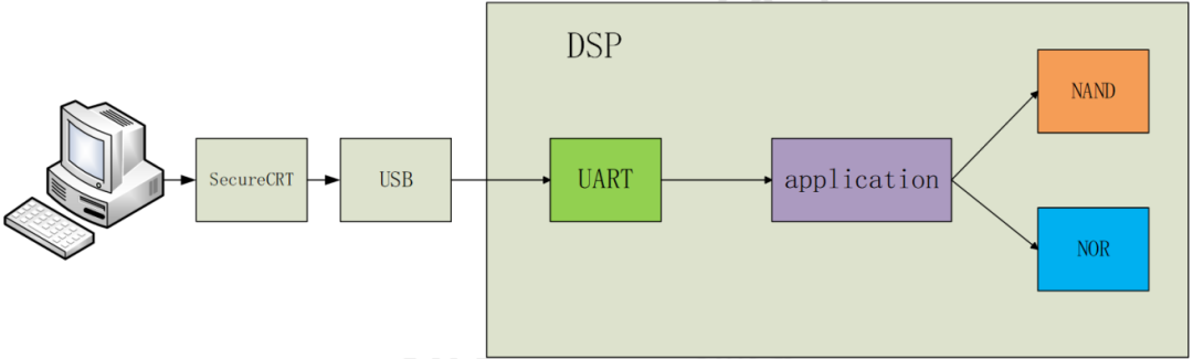 PC机使用串口调试终端软件SecureCRT,通过串口将用户程序远程固化至NOR FLASH或NAND FLASH。