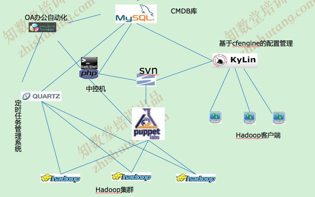 典型的大数据平台自动化运维系统,应该包含OA系统(实现页面操作、工作流管理)、CMDB(配置管理数据库)、配置管理工具、堡垒机(中控机)、定时任务系统、持续集成系统等。
