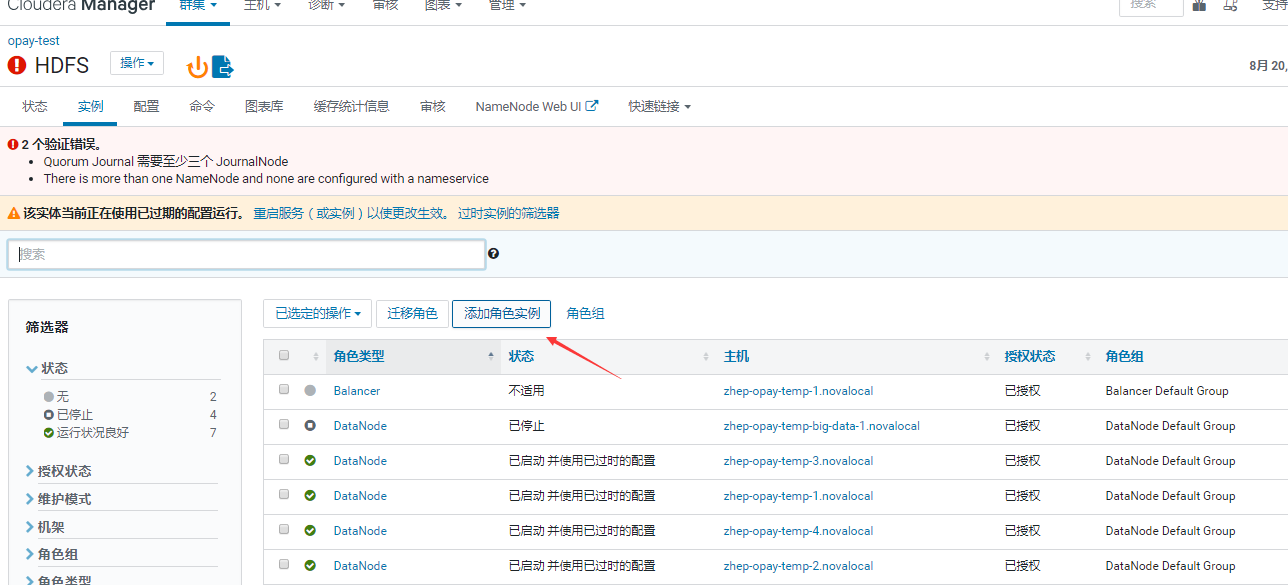 1/ 作业有问题: 查log,没log再跑一次查log. 如果没有log的情况,比如hiveserver2挂了,查strr. 2/ 查集群名字 #看hdfs集群的名字,在cdh的hdfs配置中查:nameservice 3/ 添加角色 主机--角色,可以看各节点角色 添加,比如hdfs角色,可以选hdfs 选择要添加的角色和主机: 来源:oschina链接:https://my.oschina.net/u/4359745/blog/3424761 标签 HDFS