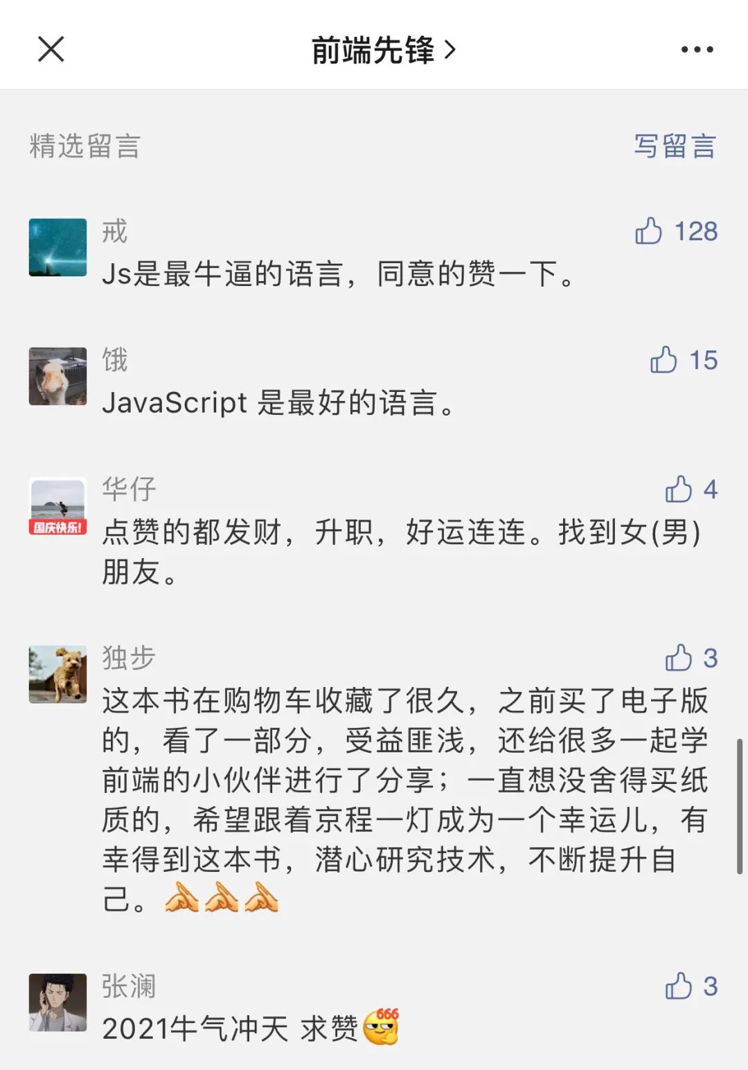 留言点赞数第二名🥈——饿 ,第三名🥉——华仔 ,以及3位走心留言的同学——独步、张澜、0078狙击手,将获得特别版(非实体书)。