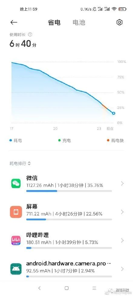 随后有一位用户更直接晒图,他的小米11在轻负载的情况下仅使用了6小时40分钟,耗电量就降低到20%左右,截图显示耗电大户分别是微信和屏幕,微信耗电量占比36%、屏幕耗电量占比23%。
