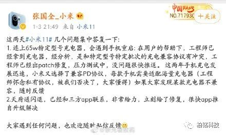 有网友反映小米11插上65W充电器后会出现无限重启的问题,这方面已得到小米方面人员的正是,小米方面表示正在加快软件升级,通过软件升级可以迅速解决这个问题。