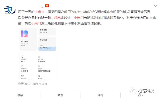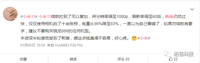 还有用户反映小米11存在耗电过快的问题,其中一位用户表示使用相机拍摄10多张相片就消耗了15%的电量;另一位用户表示明显感觉到手机后背发热厉害、后台程序过多时会出现卡顿等问题,导致手机续航难如人意。