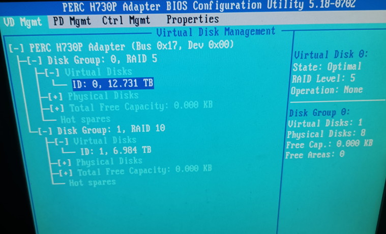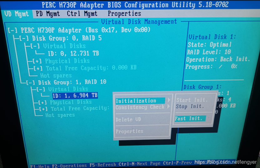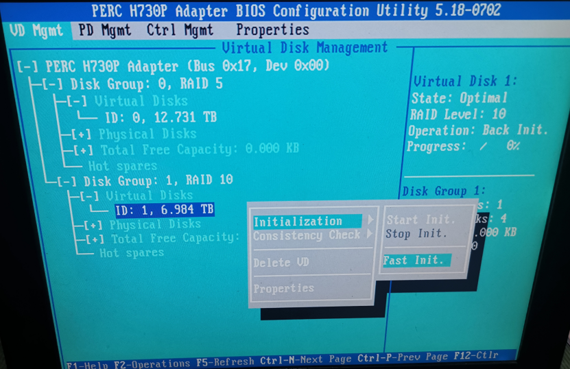 按ctrl+p回到VD Mgmt界面,选中PERC H730P Adapter (Bus 0x17 ,Dev 0x00),并按下F2,选择 Create New VD,进行创建阵列